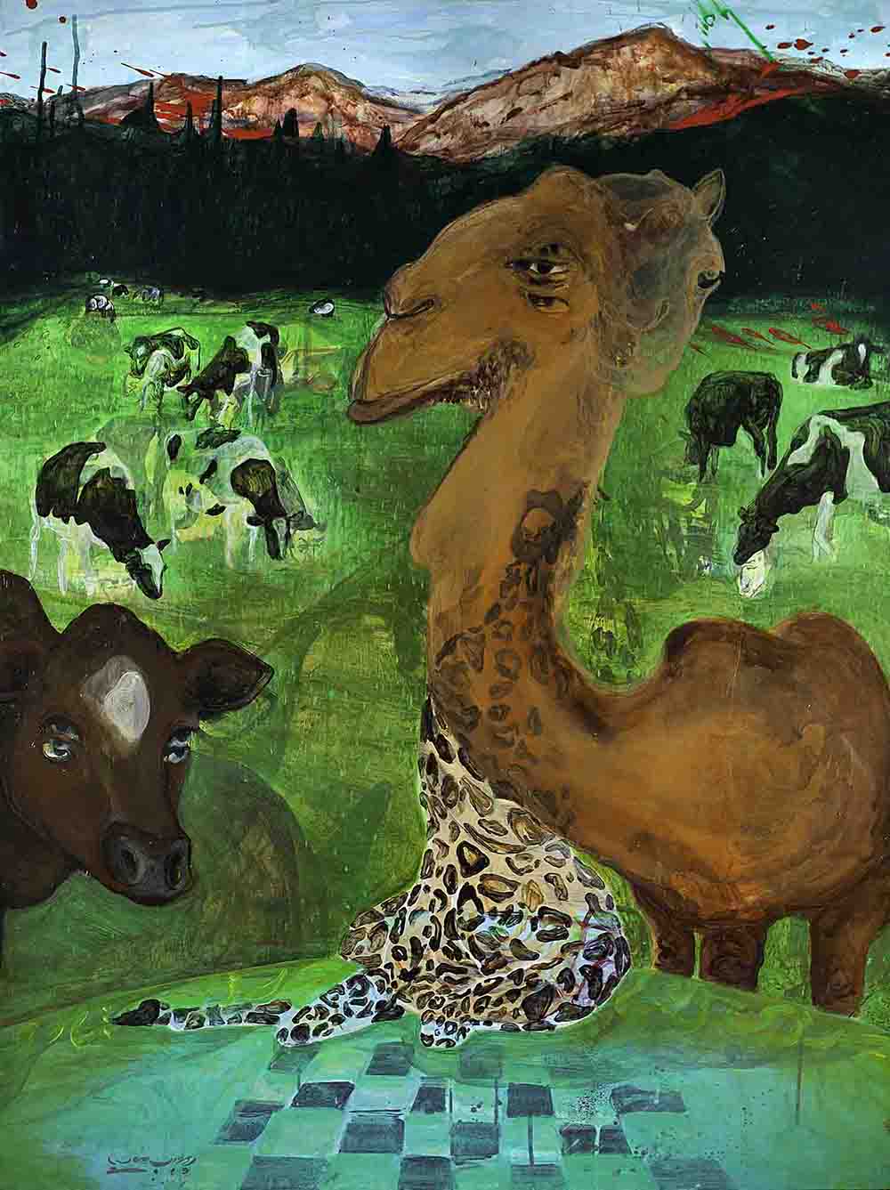 Korsi- Sher is a series of works that are based on proverbs inspired by the poetry of Iran.They are fables, animal tales with a moral, dramatic personae that behave like people, communicating ideas or truth in a metaphorical manner.These animals appear in mono episodes and their ethical and moral teachings are interpretation or continuation of another age old tradition that started with the legendary book of “Kalila Wa Demna” and “The City of Birds” of Poet Attar Nishapuri, and recently the much admired “City of Tales” of Bijan Mofid.